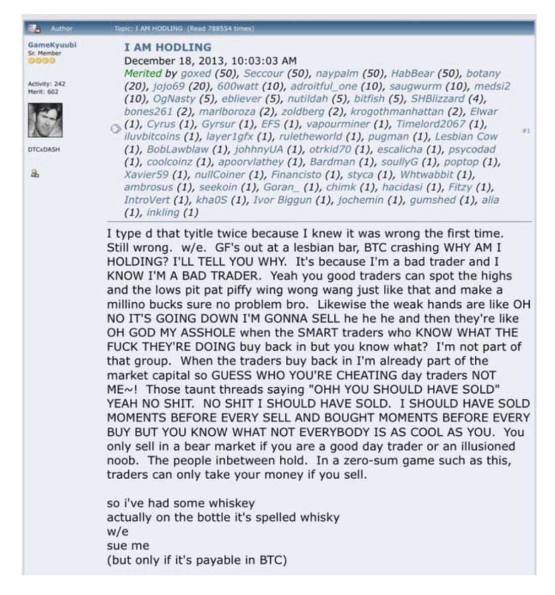 En 2013, GameKyuubi, hizo una publicación en el foro de BitcoinTalk y con un error tipográfico, indicando “hoDLing” en vez de “hoLDing”. Esto lleva a la comunidad a tomar este “error” y adoptarlo como propio, y el resto es historia de la cultura bitcoiner.
